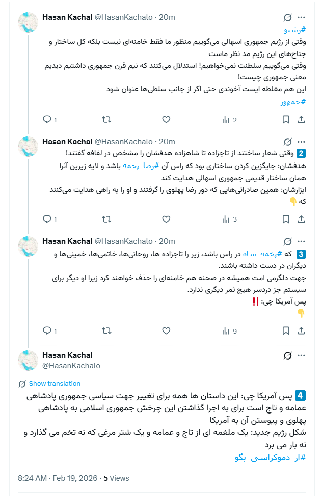 ترجمه تویت Open Source Intelligence Monitorبر اساس یک گزارش اطلاعاتی ایالات متحده که پیش از اعتراضات ضد دولتی در اوایل ژانویه گردآوری شده بود و یک هفته قبل از شروع جنگ ایران به رئیس جمهور دونالد جی. ترامپ نشان داده شد، رضا پهلوی، ولیعهد تبعیدی ایران، به این نتیجه رسیده بود که فاقد شبکه کافی در داخل کشور برای رهبری یک سرنگونی مؤثر جمهوری اسلامی است. ولی ... متن کامل
